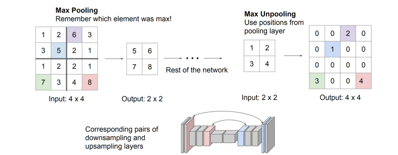 맥스 풀링 할 때 위치정보만 남겨두기. 완전한 역연산이 아니기 때문에 숫자는 달라질 수 있지만, 해당 위치에 Max 값이 있었다. 는 동일