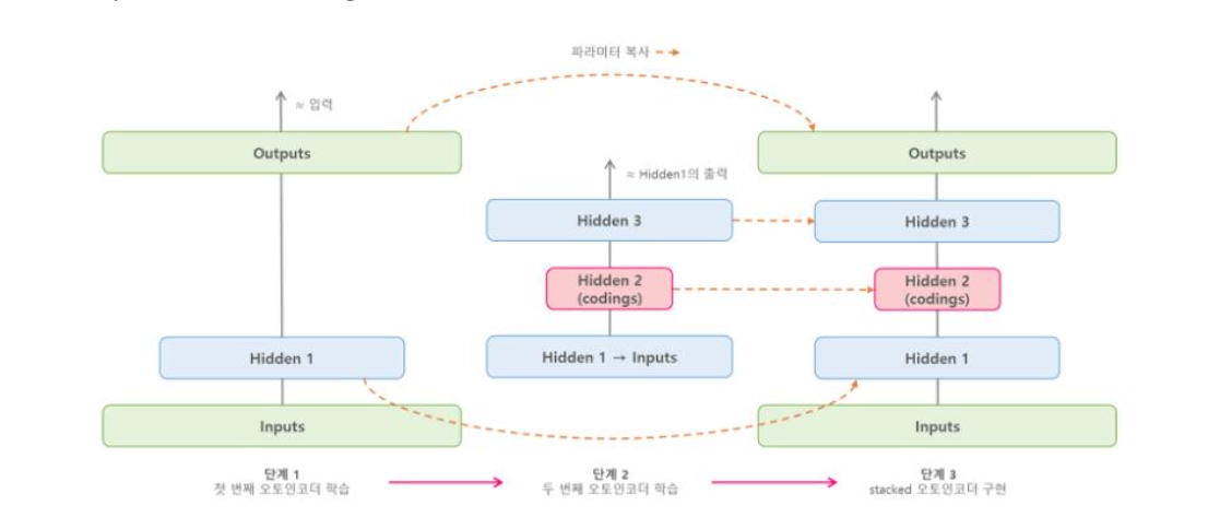 오토인코더는 각 층을 한번에 모두 학습하는 것이 아니라, 한 층씩 차례로 학습시켜 쌓아가는 방법