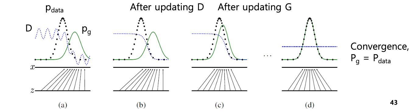 D가 잘 분류하면 이거를 속이기 위하여 G가 p data를 따라가게끔 학습.