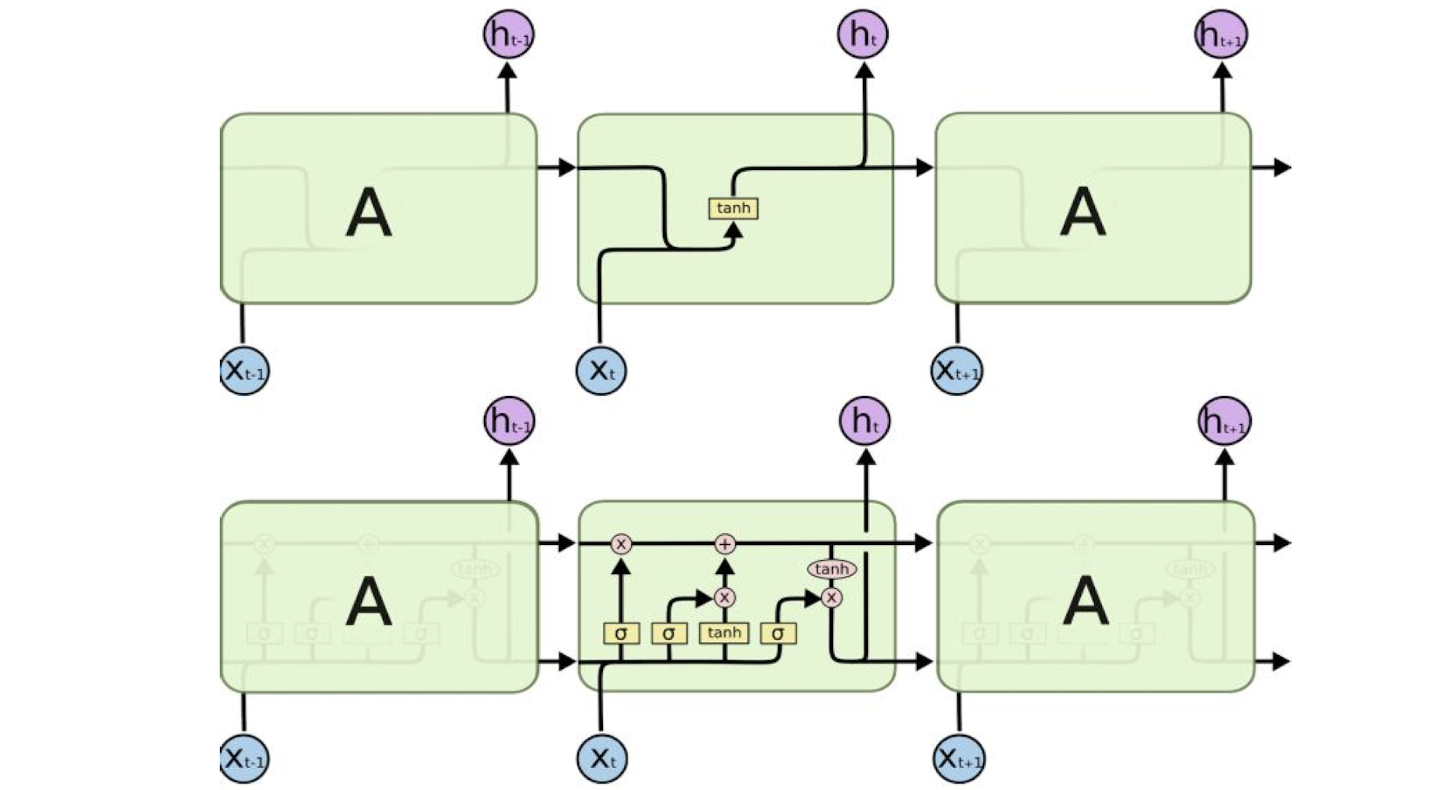 위 그림은 기본 RNN, 아래 그림은 LSTM