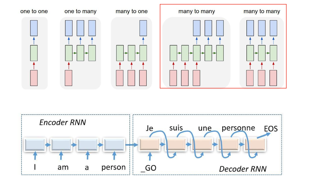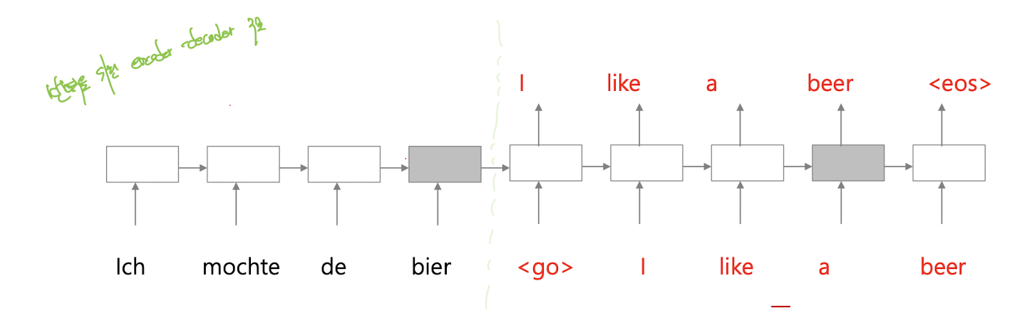 위쪽: "<\go> I like a beer" (영어 출력 시퀀스, 디코더)