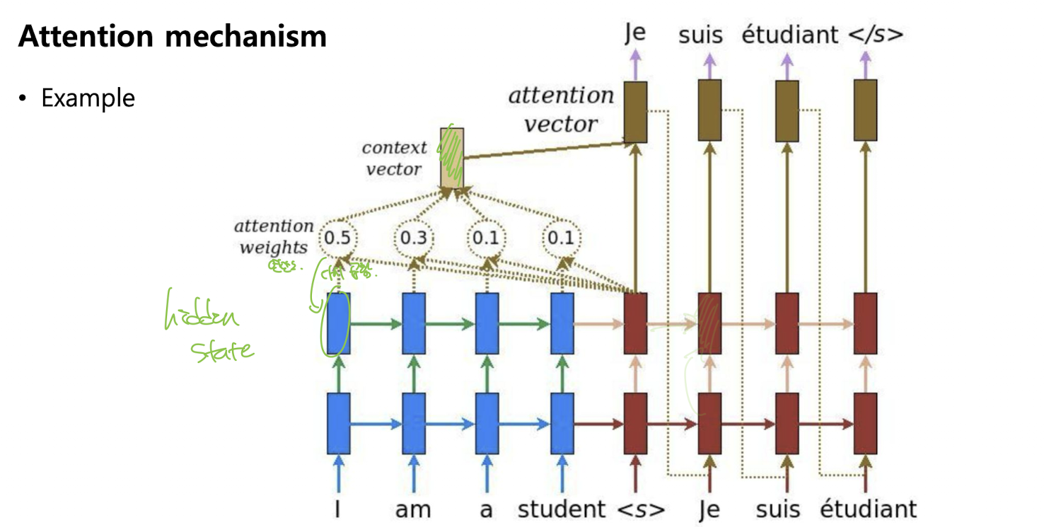 -> 인코더의 은닉 상태들 중 현재 디코더 은닉 벡터와 관련있는 인코더 은넥 벡터에 더 많은 가중치를 줌. (attention weight)
