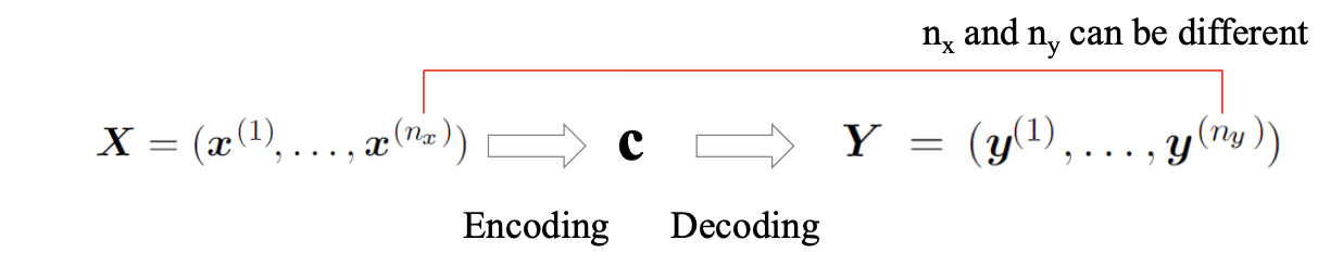 입력 시퀸스와 출력 시퀸스의 길이가 다를 수 있다. 번역, 질의응답 등 .. 이때 입력 시퀸스 전체의 의미를 context vector c에 담아 해당 벡터를 기반으로 출력 시퀸스를 생성하는 것이 seq2seq의 원리