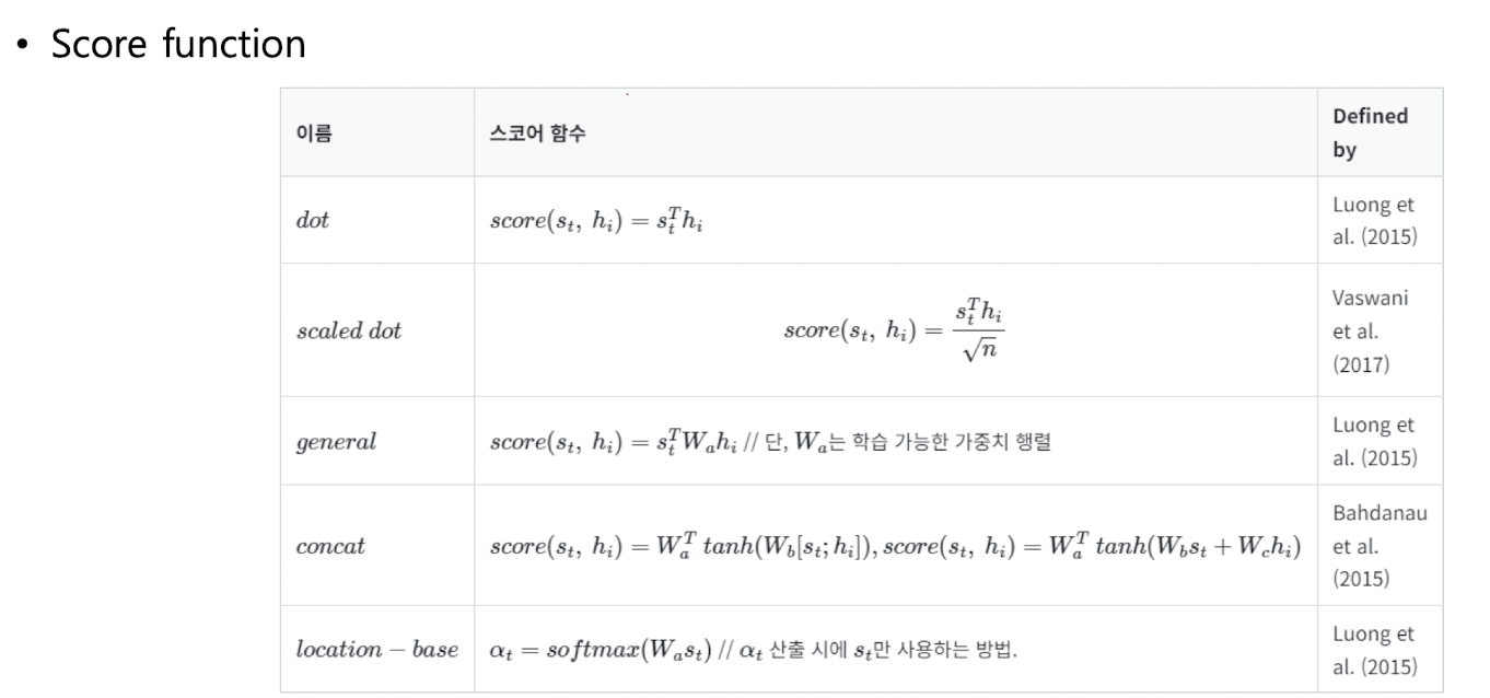 각 인코더 hidden state hi와 디코더 hidden state st의 유사도를 계산해 attention score et,i를 만든다.