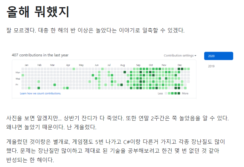 뭐, 그랬습니다. 작년에 비하면 공부도 좀 해봤고 여러가지 경험도 해봤어요. 솔직하게 말하면 만족도는 5점 만점에 3.5 정도인데, 올 해 들어서 저 자신에 대한 기대가 높아졌거든요. 그래서 그런 것 같기도 하고. 작년에 반성하고 하고 싶었던거랑 비교하면 훨씬 나아진 저라고 자부할 수 있습니다. 아마도?