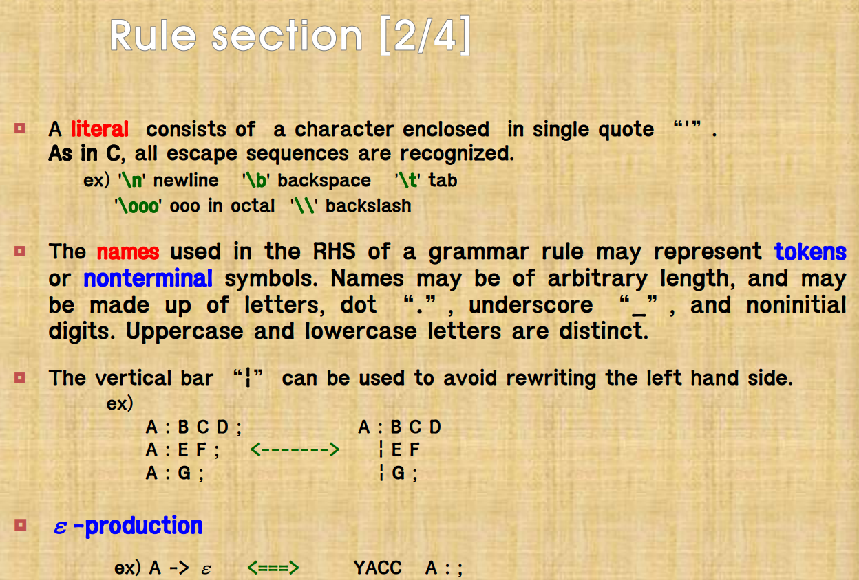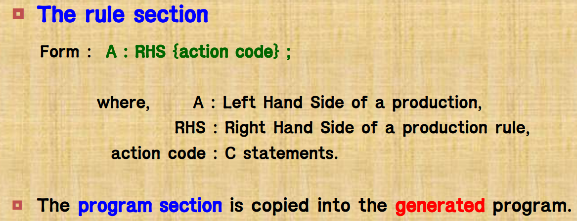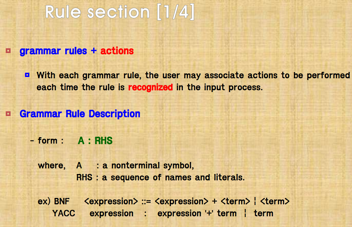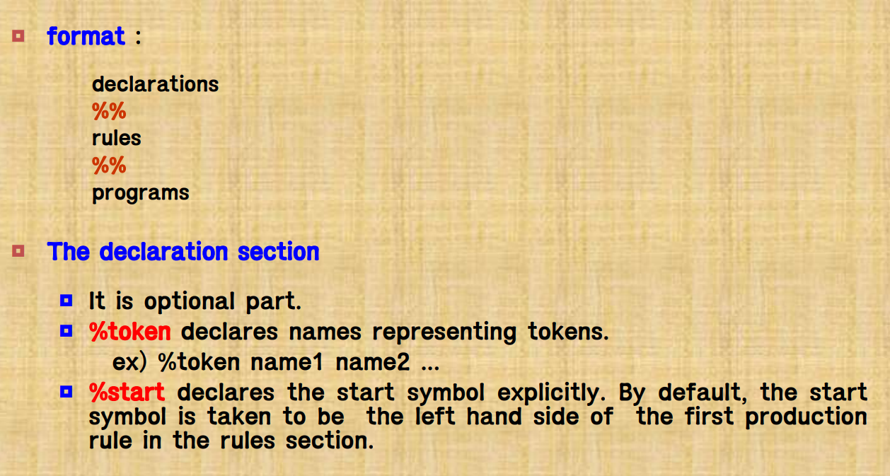%token - 규칙들을 정의 터미널 심볼을 정의할수있다.
