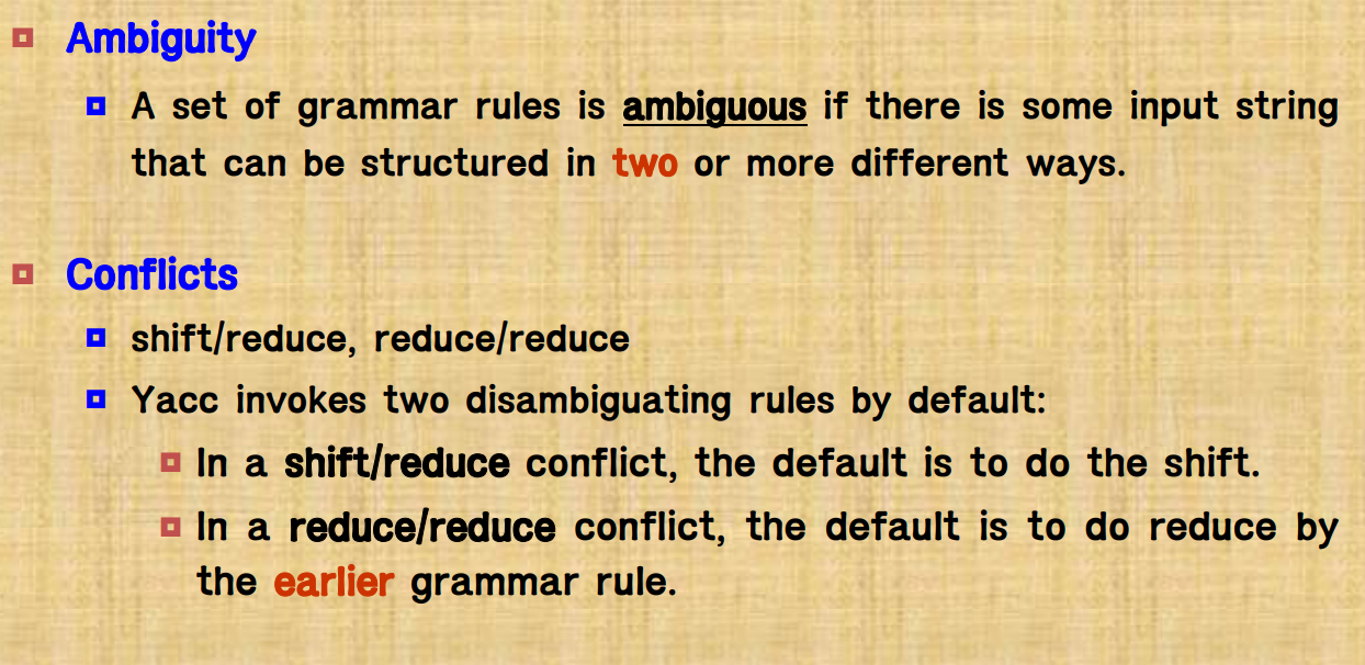 모호한 트리가 발생할거같으면 shift reduce conflict가 발생하고 일단은 shift우선으로 실행한다.