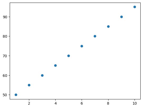 plt.scatter(study_hours, exam_scores)