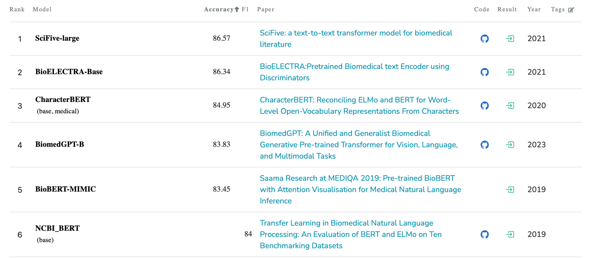 https://paperswithcode.com/sota/natural-language-inference-on-mednli : MedNLI SOTA models