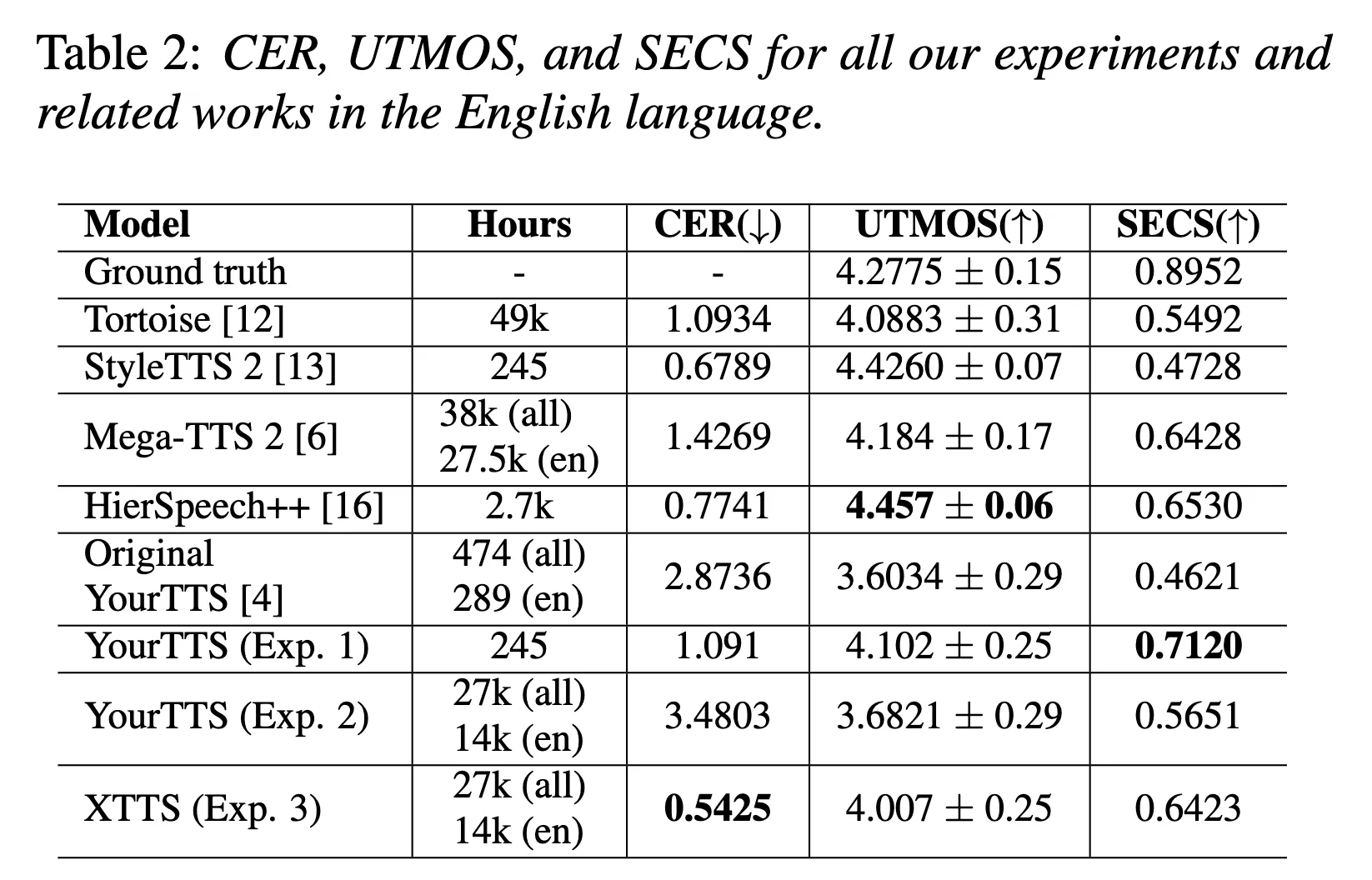 XTTS는 CER이 매우 낮고, 우수한 성능을 보임. 영어 데이터에 대해서 UTMOS, SECS 점수에서도 꽤 좋은 결과를 얻음. → XTTS가 정확한 단어의 음성을 생성하면서도 발화오류가 적고 자연스럽다는 것.