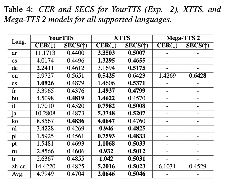 몇몇 언어에 대해서 YourTTS가 더 좋은 성능을 보이기는 하나, 대부분의 언어에서 XTTS가 CER, SECS 모두에서 더 좋은 성능을 보임.