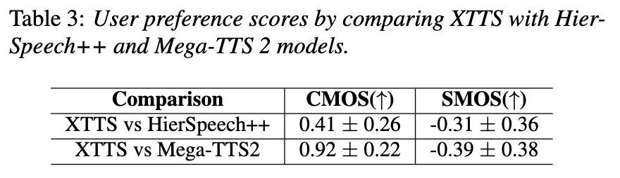 XTTS가 naturalness, acoustic quality 측면에서 더 사용자에게 선호되는 결과를 보인다.