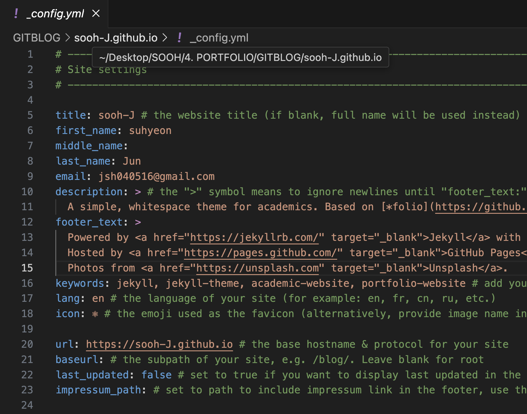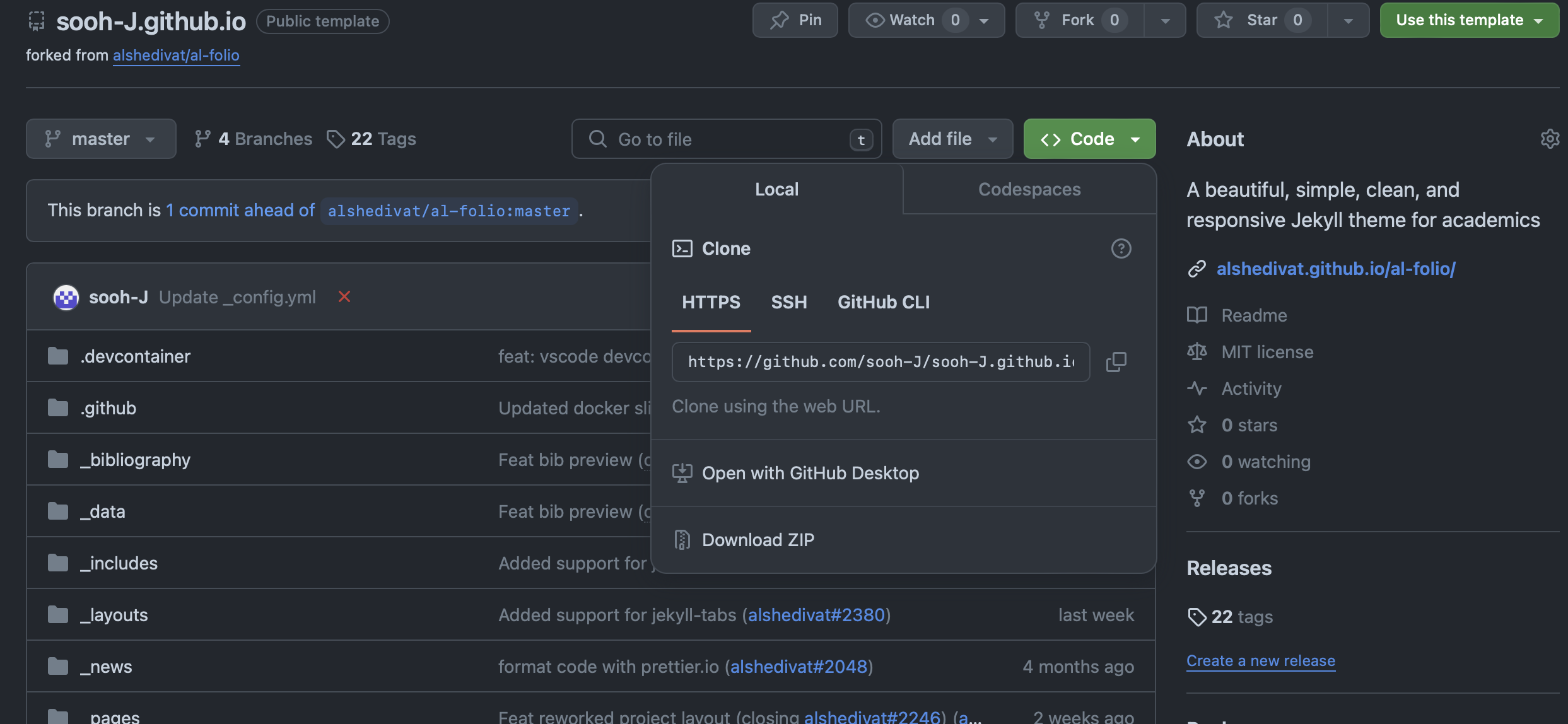 <> Code 버튼을 클릭하여 주소 복사sooh-J를 본인의 username으로 변경해주세요 >> git clone https://github.com/sooh-J/sooh-J.github.io.git