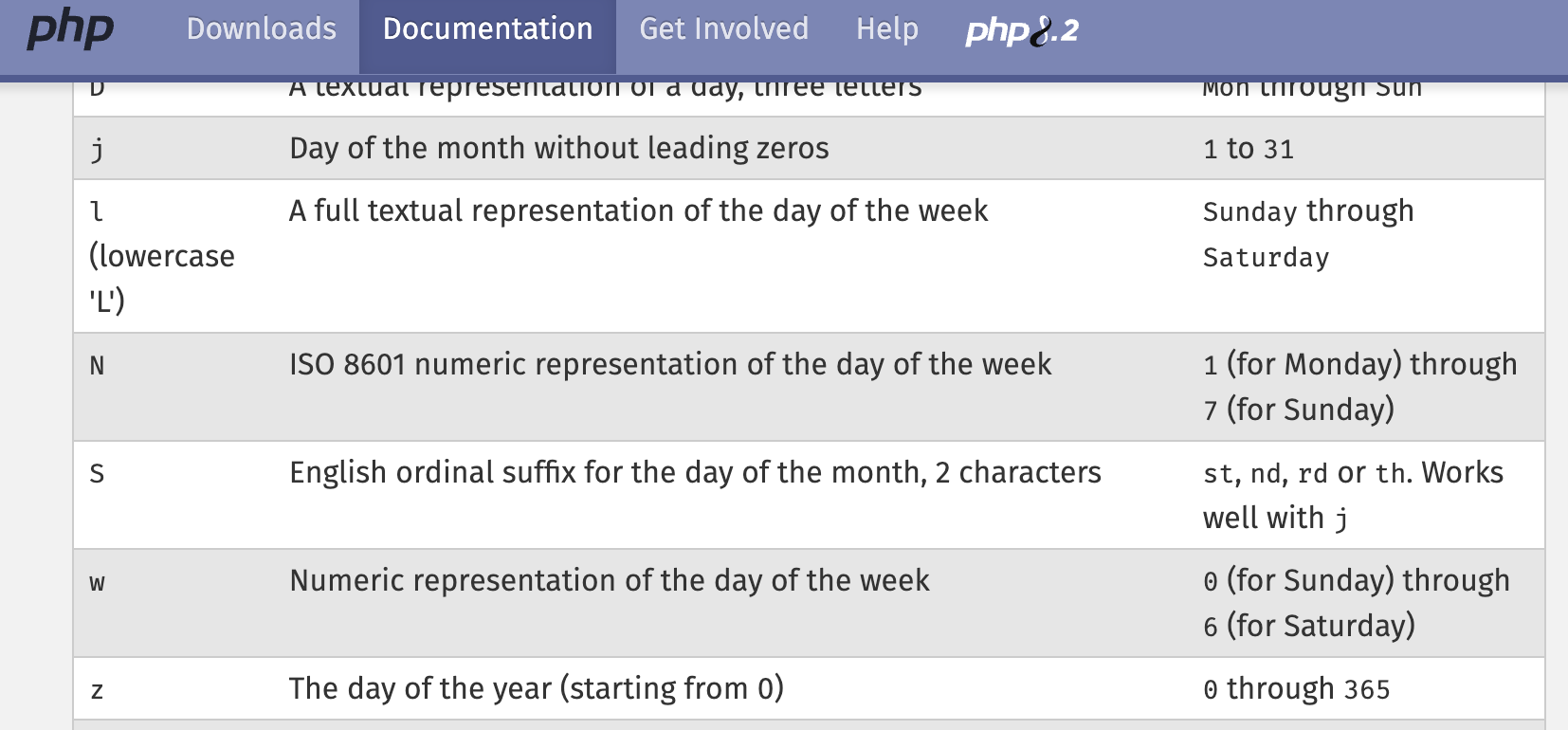 : php 공식문서 ,date () 중에 "w" : 한주의 각 요일을 숫자로 대신해주는 객체