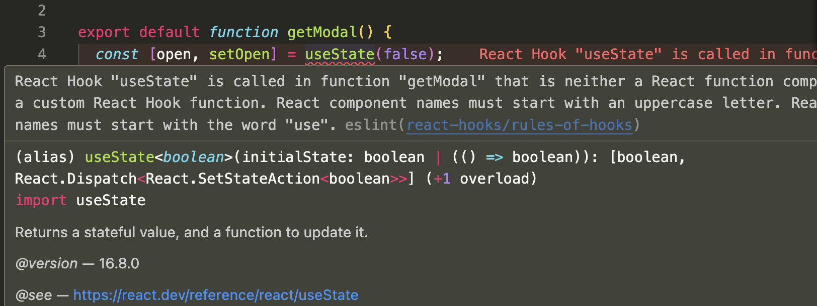 useModal을 getModal로 변경해서 일반 함수인 척 하니까 에러로 알려준다.eslint-plugin-react-hooks 설치된 eslint 플러그인에서 알려준 거였다.모달 컴포넌트 코드
