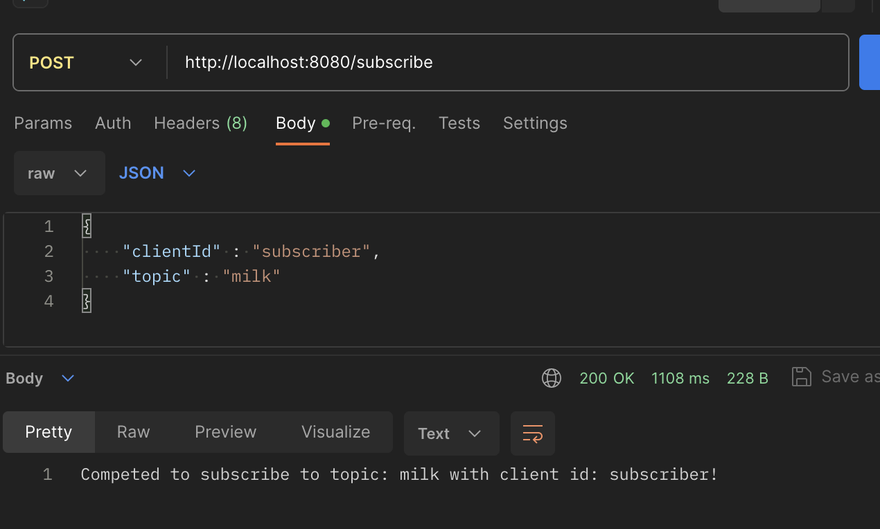 return "Message publish completed! Message: " + request.getMessage() + " to topic: " + request.getTopic() + " with client id: " + request.getClientId() + "!";