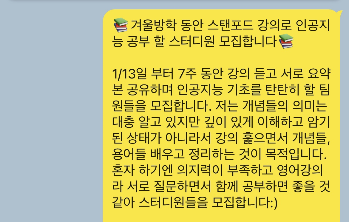 머신러닝에 대한 기초가 부족한 것 같아 2025 01월~ 02월 겨울방학에 스터디 팀원들을 모집해서 머신러닝 수업을 들었고 성공적으로 마무리했다ㅎㅎ