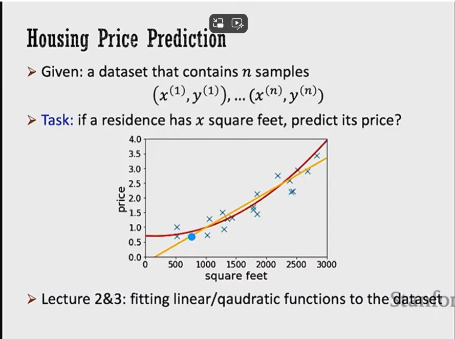 새로운 x(집크기) 값이 주어졌을때 y(집가격) 값을 예측하는것이 목표. 즉 데이터들이 어떤 경향을 가지는지(그래프처럼) 예측하는 것이다.