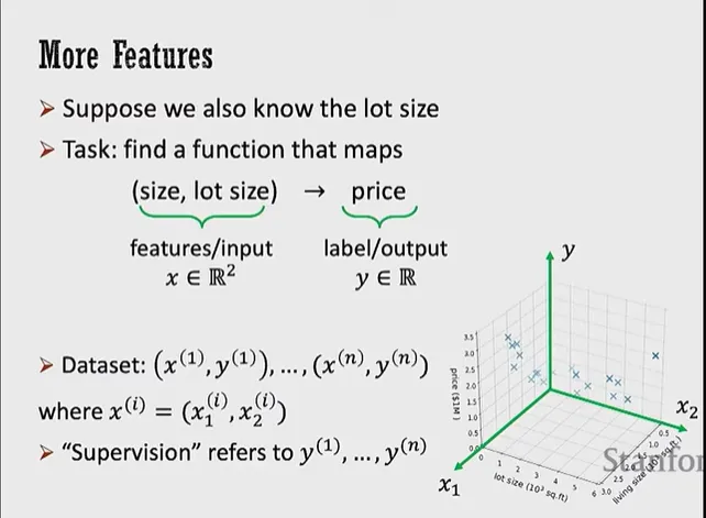 (x,y) 데이터셋들을 training 한다. x는 features, input 이고 y는 output, label, supervision 이라고 부른다
