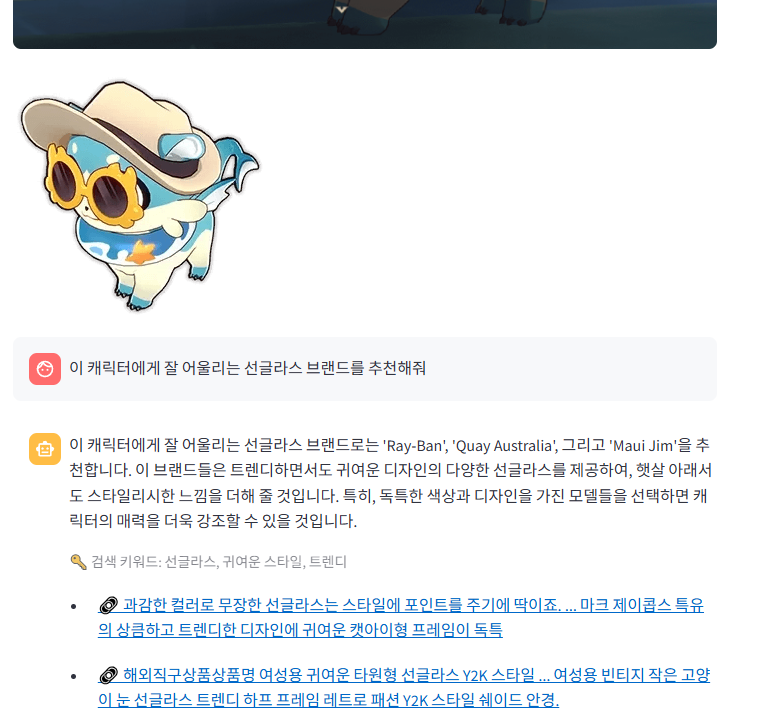 지금 생각해보면 여러가지 의류 사진들을 임베딩 해서 벡터 스토어에 저장해두고, 유저가 추천해달라고 하면 비슷한 이미지 혹은 텍스트를 가져오는 방식이 괜찮아 보인다.