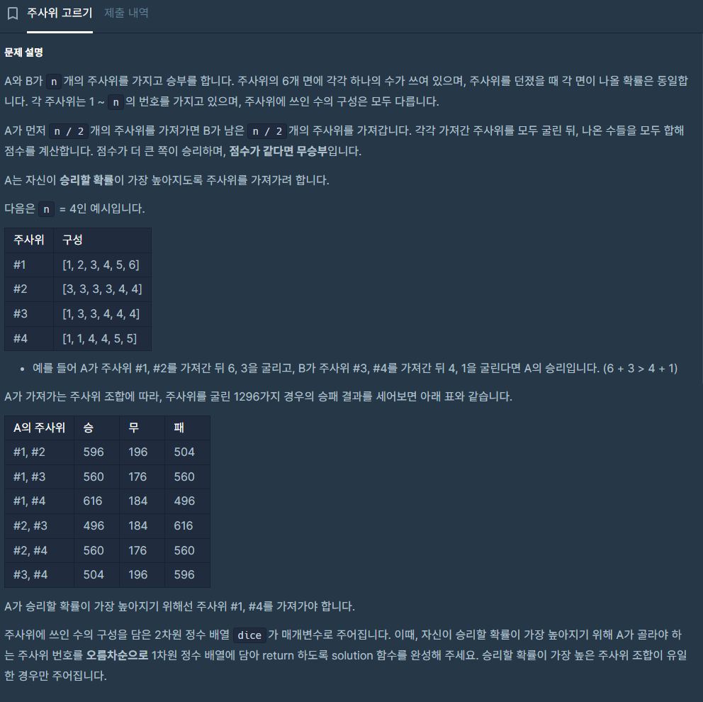 A와 B가 n / 2개의 주사위를 나눠가지고 나눠 가진 주사위를 모두 던져 주사위의 합을 구하고 A와 B가 그 합을 가지고 승부한다. 그래서 승리, 무승부, 패배의 수를 구해 A가 B에게 가장 큰 승률을 거둘 수 있는 주사위의 번호를 출력하는 문제이다