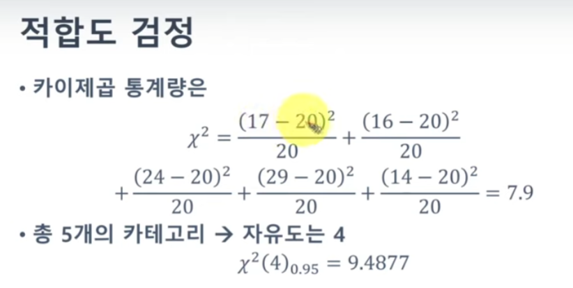 자유도가 20, 카이스퀘어 값이 20이라면 아, 대략 분포의 평균 근처구나 하고 알 수 있다.