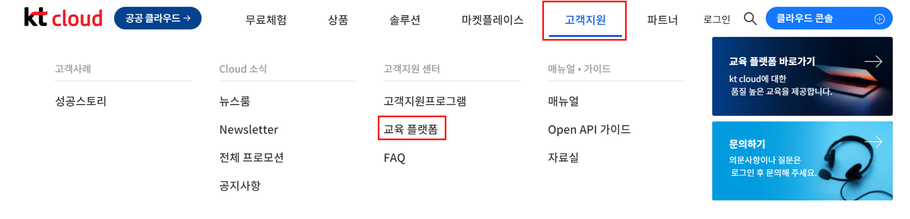 KT Cloud의 Cloud 환경에 이해하기 위해 KT Cloud 홈페이지에 방문하게 되었고, 홈페이지를 둘러보던 중 고객지원 중 교육 플랫폼을 발견하게 되었다.