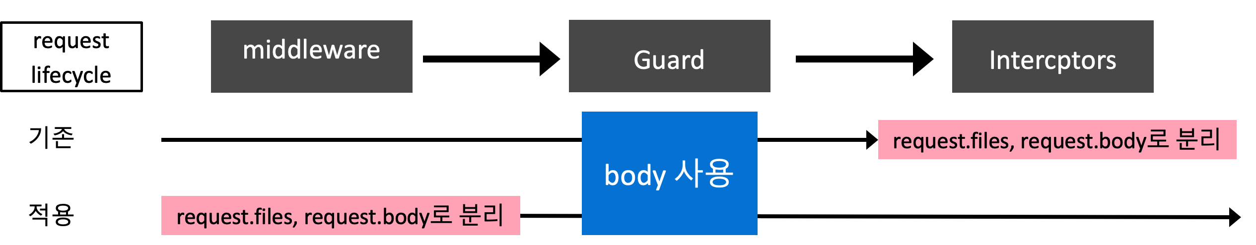 이번 해결 방법은 완벽하지 않지만, NestJS의 라이프사이클을 고려하여 Guard와 multipart/form-data 요청을 함께 사용하는 방법을 고민해본 사례로 기록하고자 합니다.