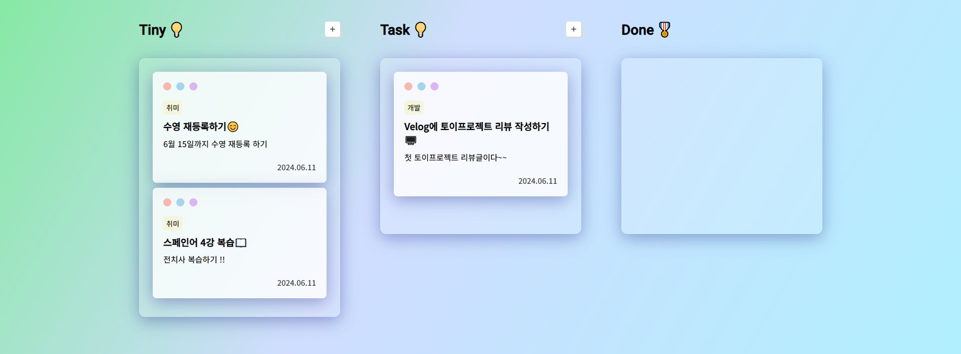 Tiny나 Task에서 작업 목록 삭제하면 바로 Done으로 옮겨지는 부분에서 한참 헤맸다.