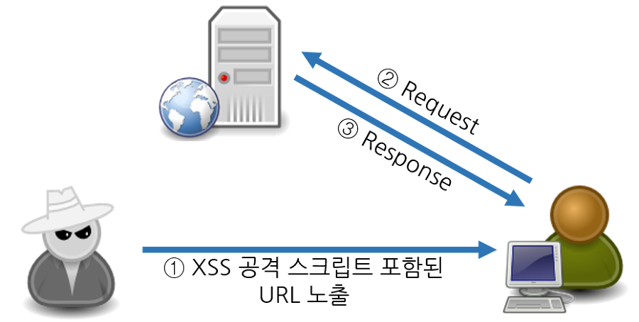 공격자는 미리 XSS 공격에 취약한 웹 사이트를 탐색하고, XSS 공격을 위한 스크립트를 포함한 URL을 사용자에게 노출시킨다.