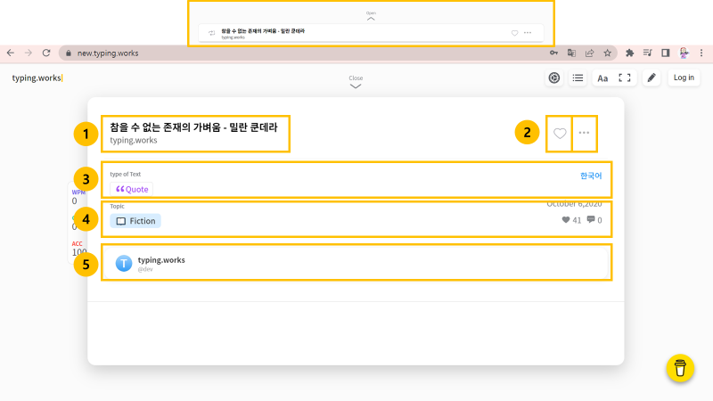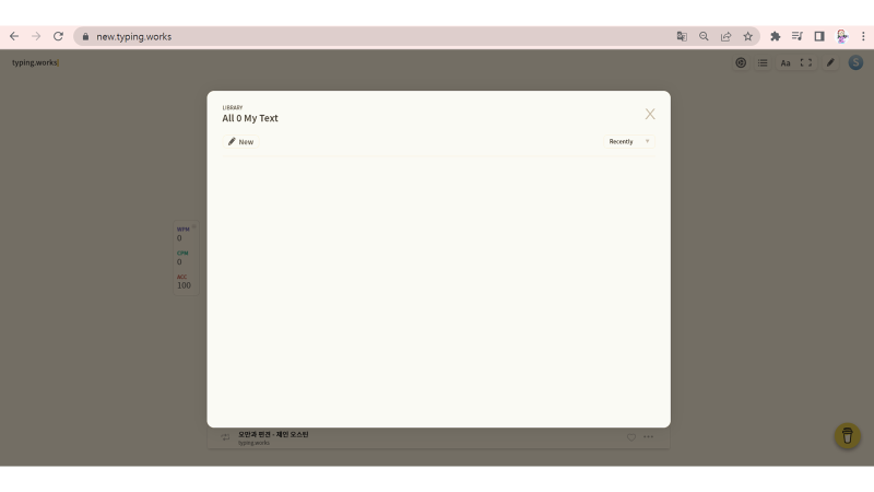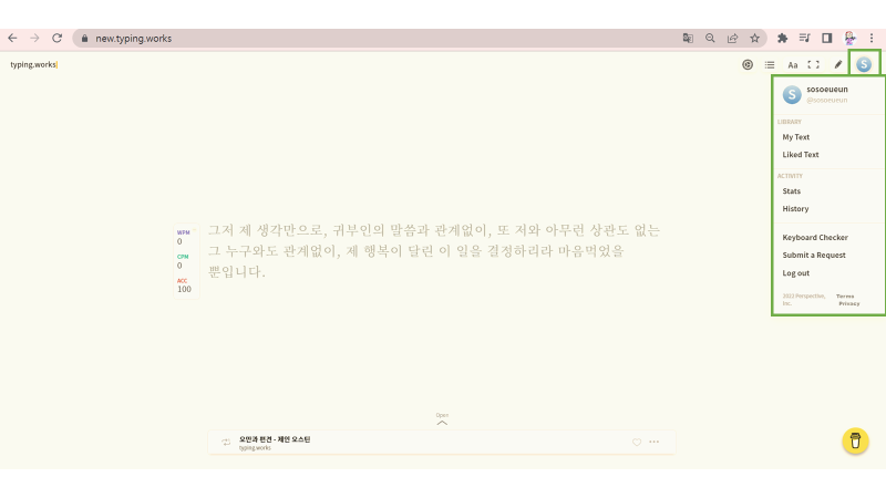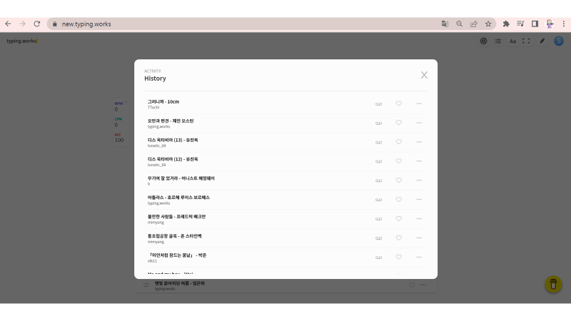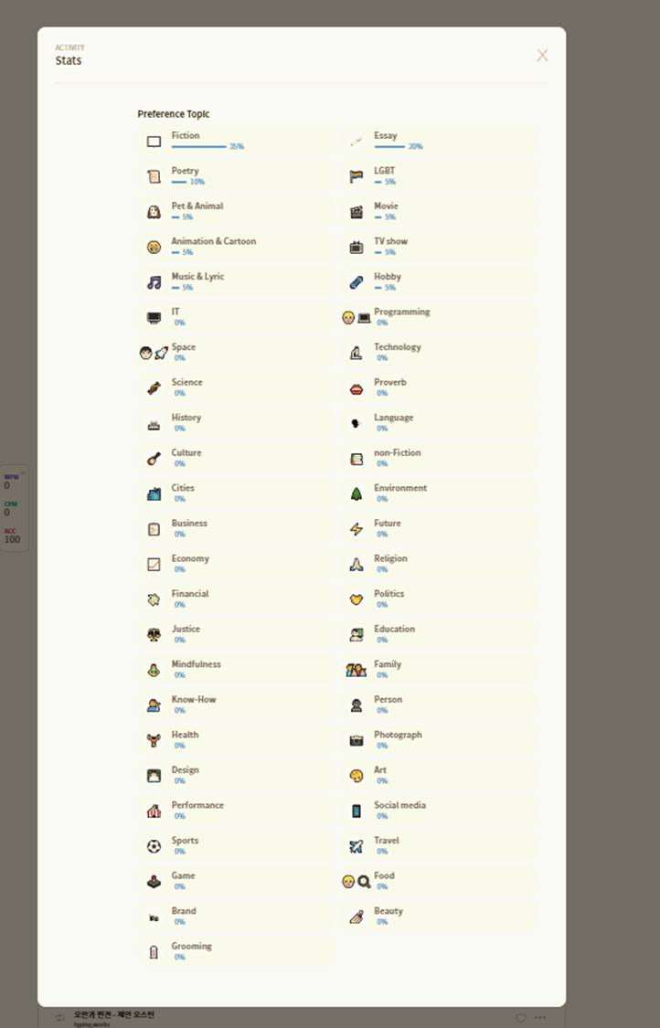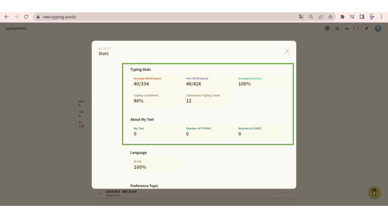 타자에 관련 된 것과, 어떤 주제를 어느정도 필사 했는지 확인 할 수 있다.