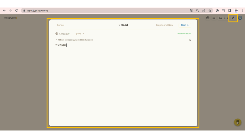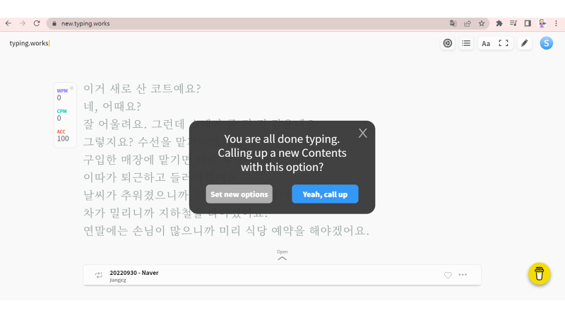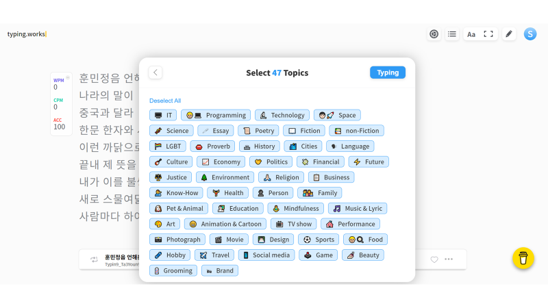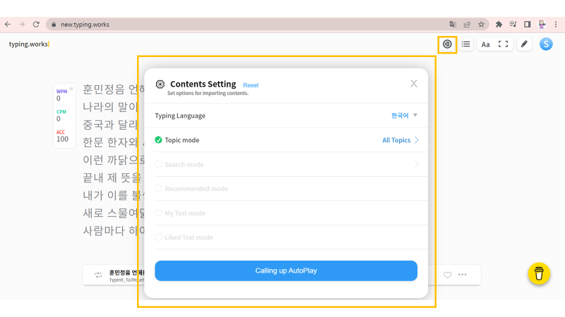 이 창은 타이핑할 언어와 여러가지 모드를 선택할 수 있다.