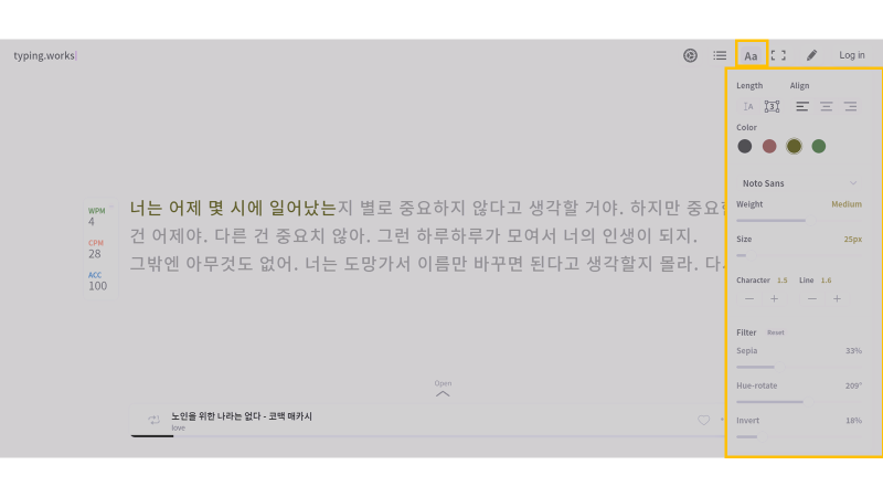 목록 버튼 옆의 버튼을 클릭하면 화면을 수정 할 수 있는 설정창이 나온다. 화면의 채도, 글자 색등을 수정 할 수 있다.