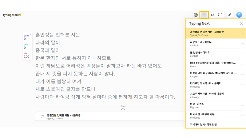 화면의 왼쪽에 있는 작은 네모 박스에서 자신의 타자 실력을 확인 할 수도 있다.