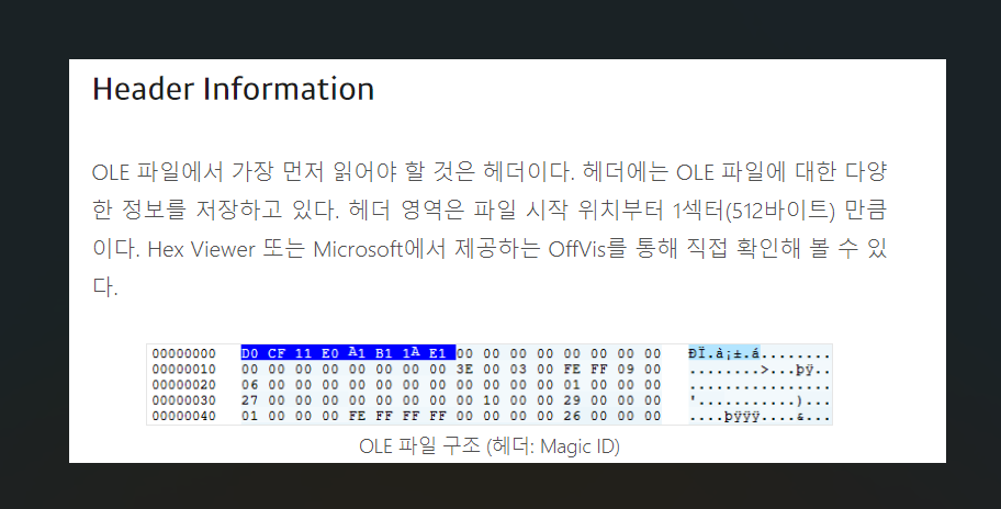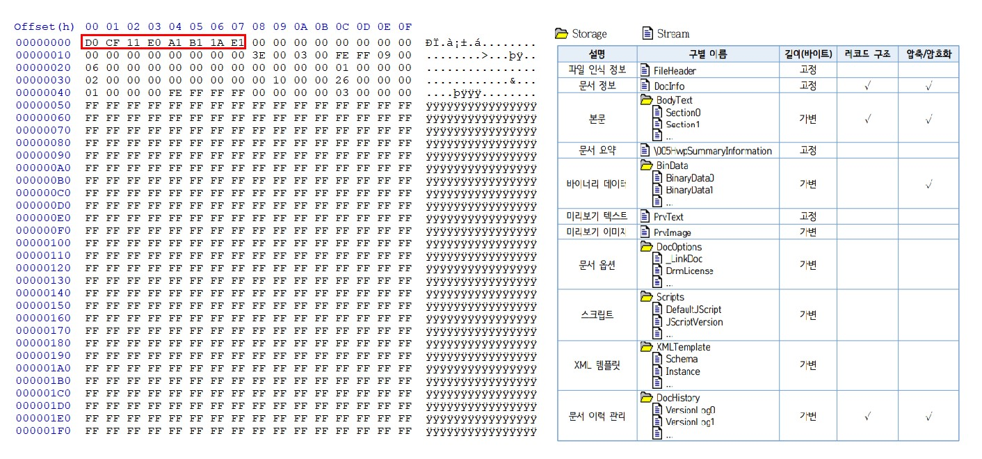 요약하자면 doc, xls, ppt, hwp 파일은 이진수 형태로 파일마다 각자의 구조를 가지고 있다는 것이다.