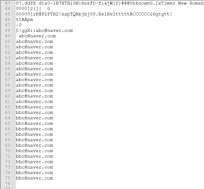 텍스트 본문이 있는 wordDocument stream에 Unicode 블록과, ANSI(ascii) 블록이 함께 쓰이고 있음을 알 수 있다.