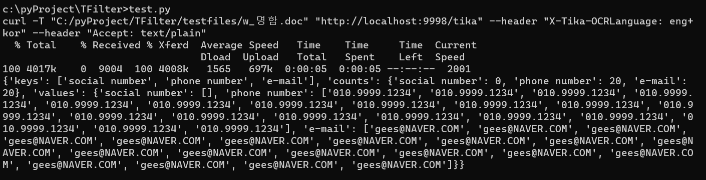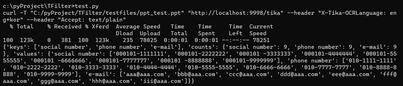 tika-server에서 텍스트를 받으면, 그 텍스트 중 개인정보 내용을 출력하는 것이다.