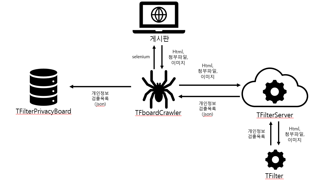TFboardCrawler는 게시판에서 게시글(html), 첨부파일, 이미지 파일 등을 다운로드 하고, 이를 curl을 통해 TFilterServer에 전송하는 방법으로 개인정보 검출 결과를 얻을 것이다.