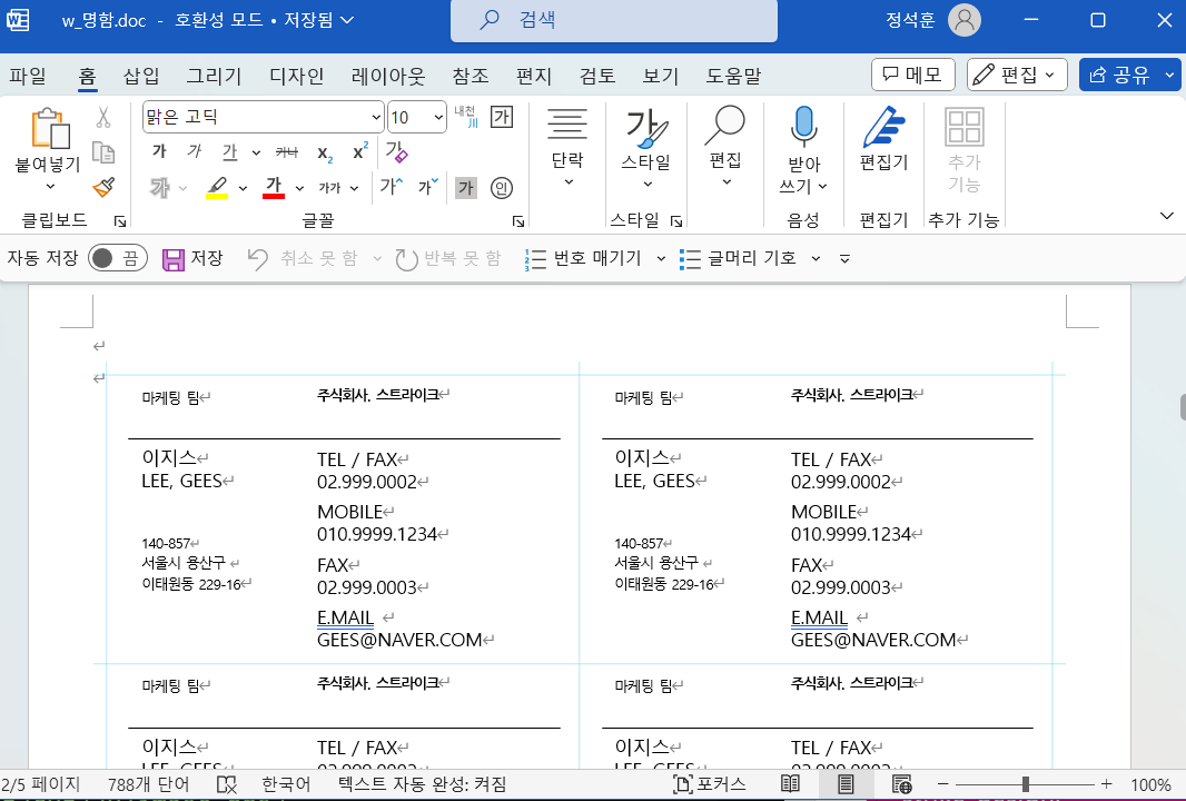 전화번호 이메일 등이 적혀있는 w_명함.doc 파일을 준비했다.