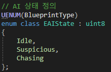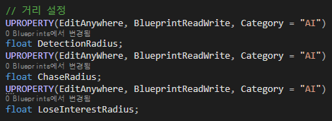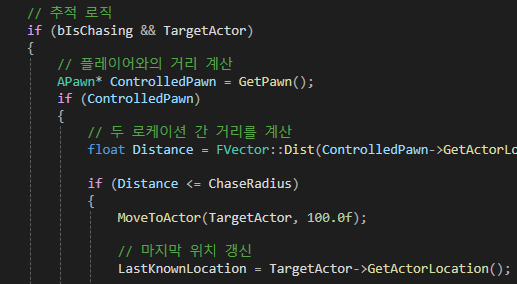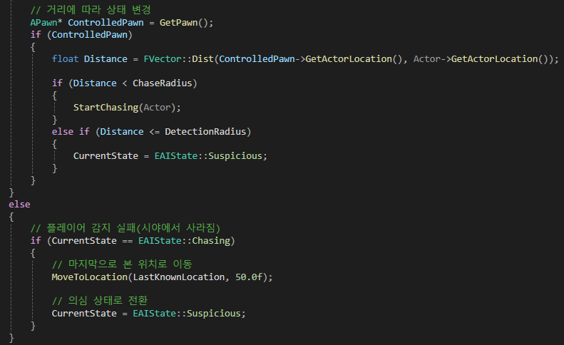 함수에서도 AI 캐릭터가 플레이어 캐릭터를 인지했을 때, 서로 간의 거리에 따라 AI 캐릭터의 상태를 변경