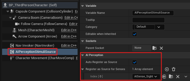 마지막으로 플레이어 캐릭터도 AI에게 인지될 수 있도록 AIPerceptionStimuliSouceComponent