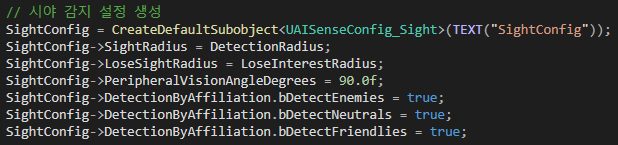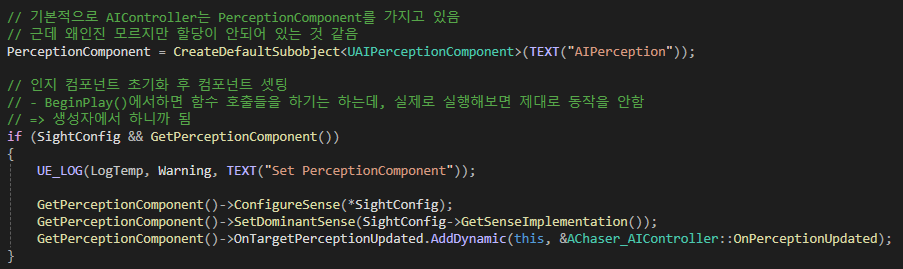AIController는 기본적으로 AIPerceptionComponent를 가지고 있음. 근데 할당하지 않으면 에디터에서 안보였음(그냥 포인터로만 가지고 있는 듯)