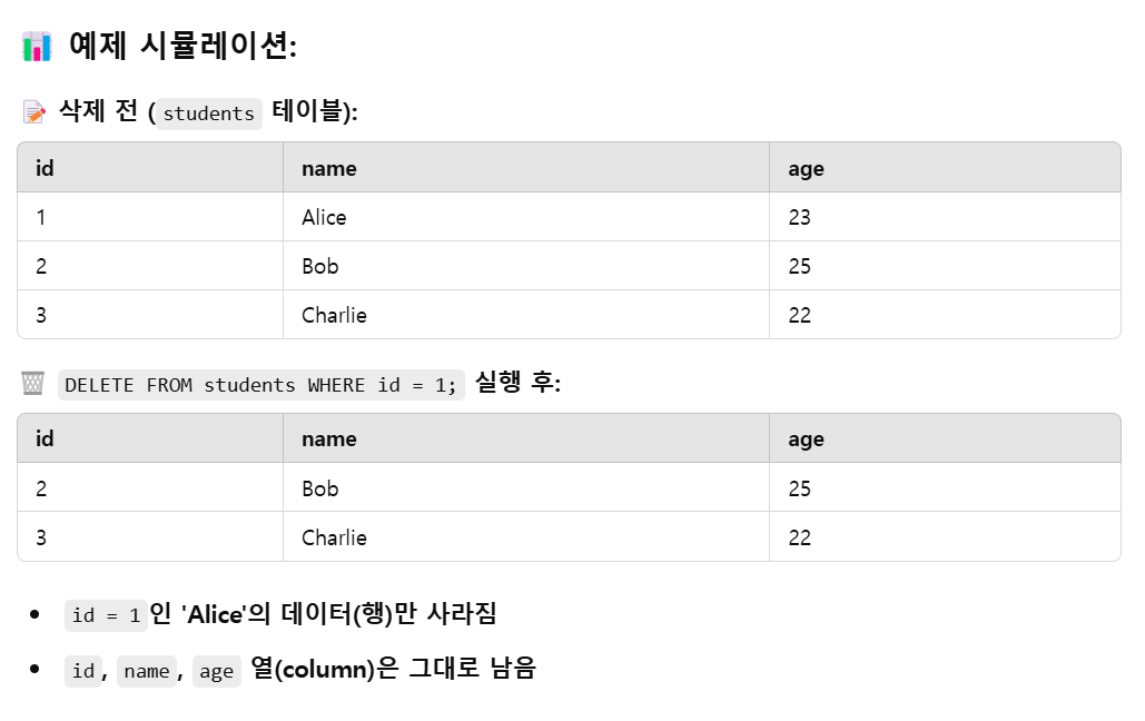 • id = 1행(row) 전체를 삭제하지만, 열(column) 구조는 유지합니다.