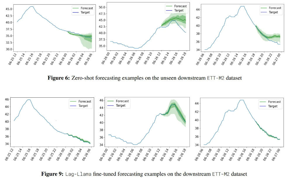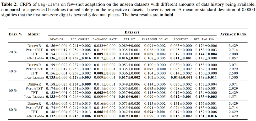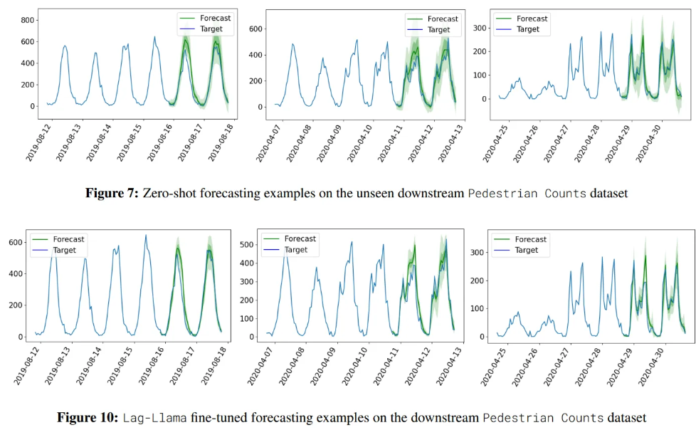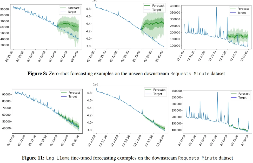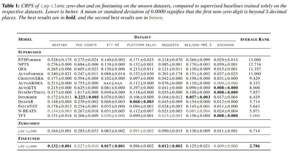 - Compared to the OneFitsAll which adapts a pretrained LLM for forecasting, Lag-Llama achieves better performance