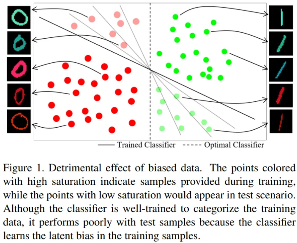 The bias represents some attributes of data points such as color, race or gender