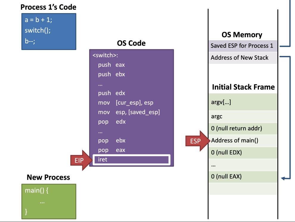 - When switch() return, run main() of the new process