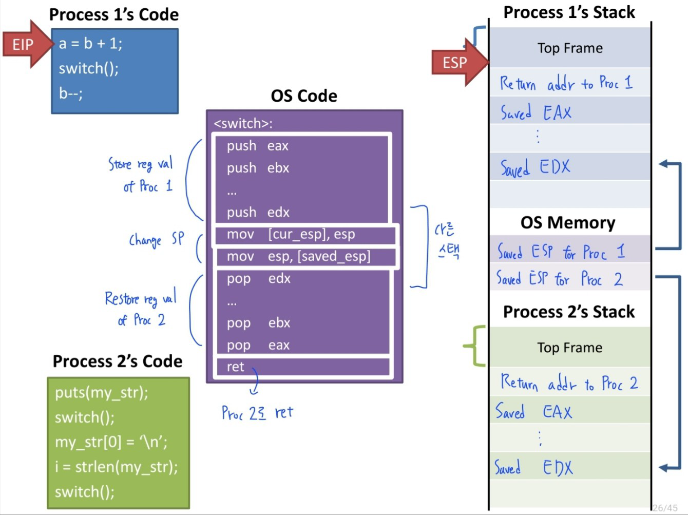 - switch() returns back to process 2
