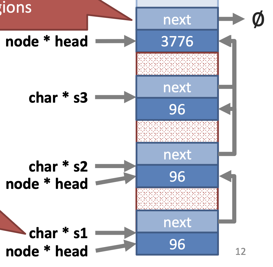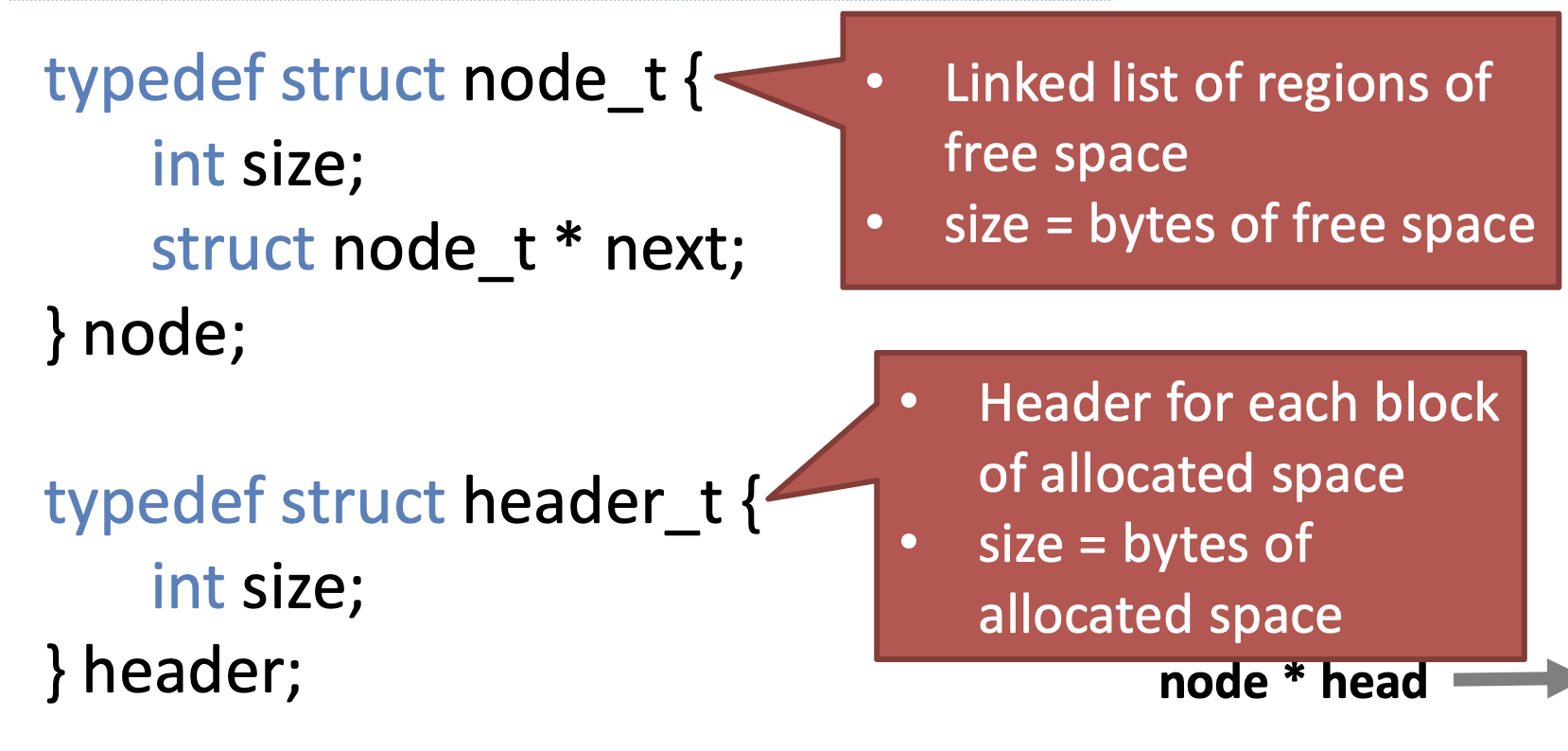 - Split the first free region with >=8 bytes available (actually 12 bytes)