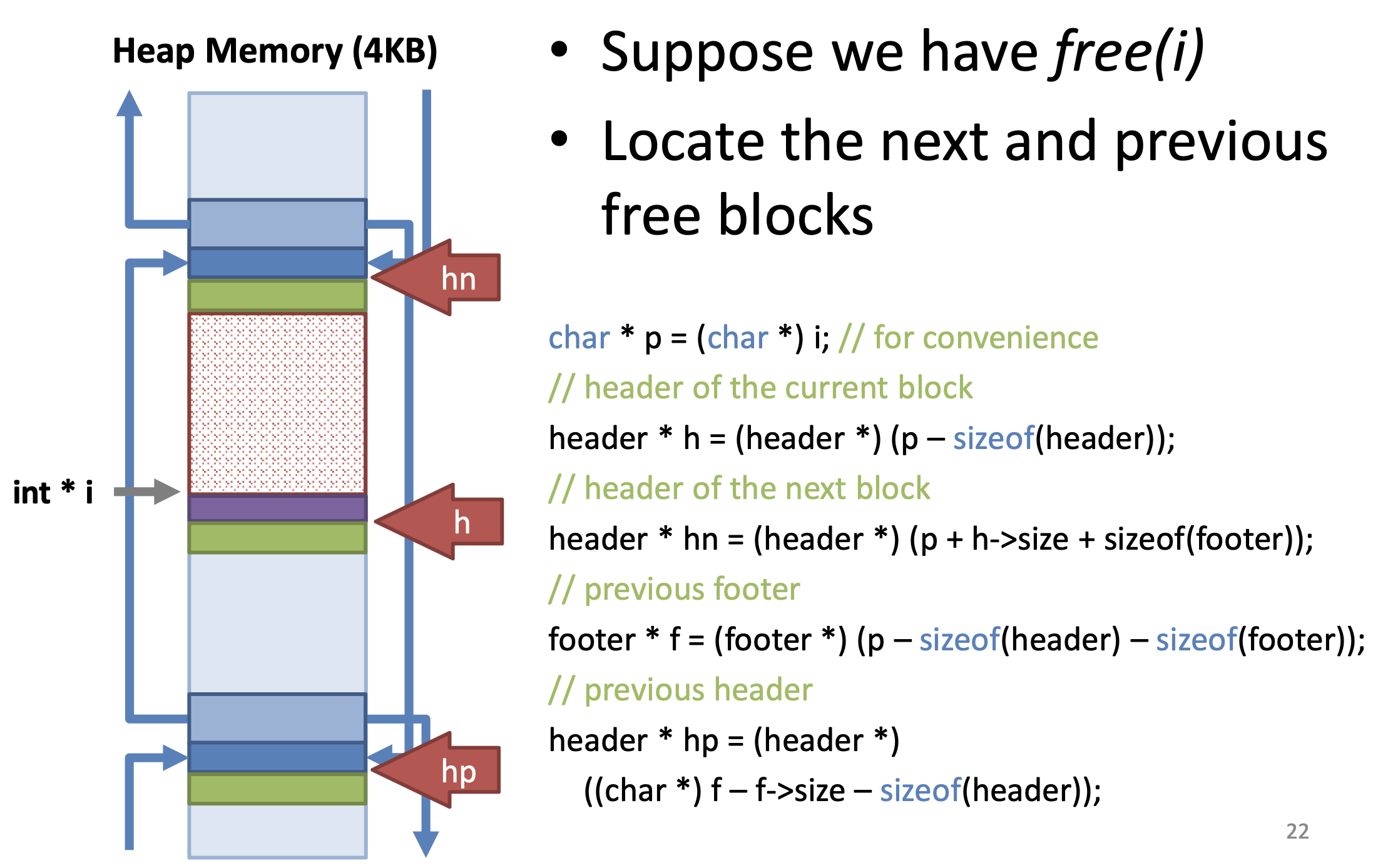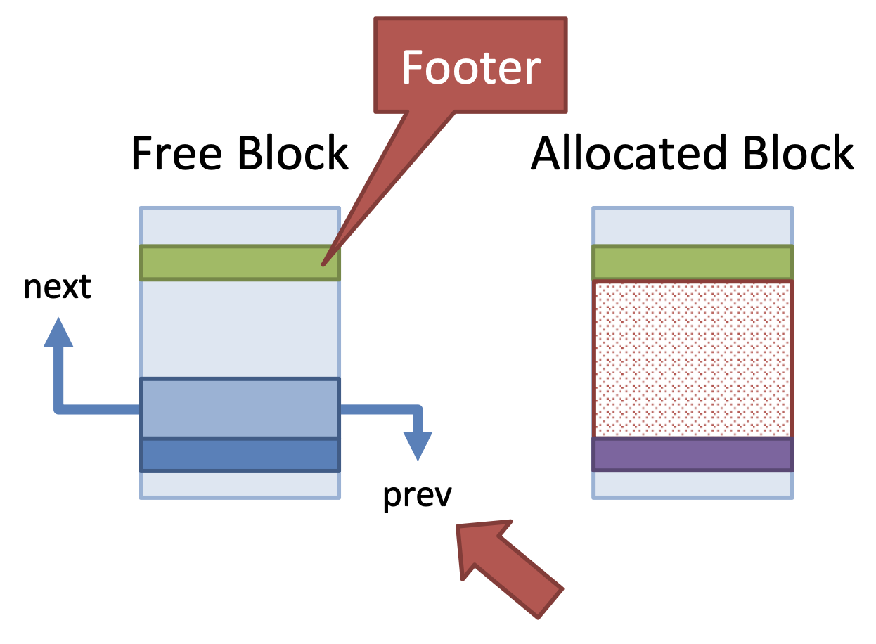 - Enables coalescing without sorting the free list (free() becomes O(1))