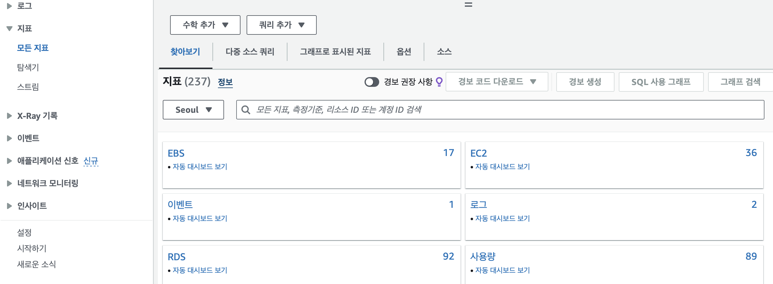 지표 : EC2나 RDS, ELB와 같은 리소스마다 기본적인 모니터링 항목